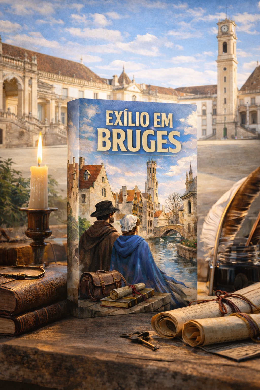 Bruges, 1867. O corpo de um advogado português é encontrado numa casa da Rua do Calvário. Na mesa de cabeceira, a fotografia de uma mulher. Nas mãos, um manuscrito em português. Um jovem funcionário consular enviado para liquidar a herança começa a ler os papéis — e descobre a biografia secreta de um homem que atravessou um século sem nunca se dobrar. Francisco Cesário Rodrigues Moacho nasceu em Campo Maior em 1799, filho de um Major liberal das guerras napoleónicas. Estudante de Direito em Coimbra, presidente de uma sociedade secreta, foi expulso, fugiu, combateu na Revolução Belga de 1830 e nunca mais voltou a Portugal — mesmo quando podia. A razão chamava-se Elise. Durante trinta anos construiu uma vida em Bruges ao lado dessa mulher belga que a história não registou. Quando ela morreu, ficou. Quando Portugal o esqueceu, ficou. Quando o irmão veio buscá-lo, ficou. Camilo Castelo Branco imortalizou-o em dois dos seus romances, referindo-se a ele como aquele que morreu "com o estigma que lhe fechou a porta da pátria, e lhe denegriu a do túmulo." Exílio em Bruges é a história de um homem que perdeu a pátria por convicção e encontrou uma vida por amor — e que escolheu o amor sem nunca trair a convicção.